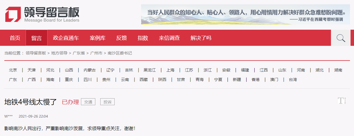 人民网广州11月17日电 (黄超然)近日,有网友在人民网领导留言板反映,广州地铁四号线运行速度太慢,影响南沙区人民出行,严重影响南沙发展。另有网友建议不停靠低涌、东涌、庆盛、黄阁汽车城等小站。