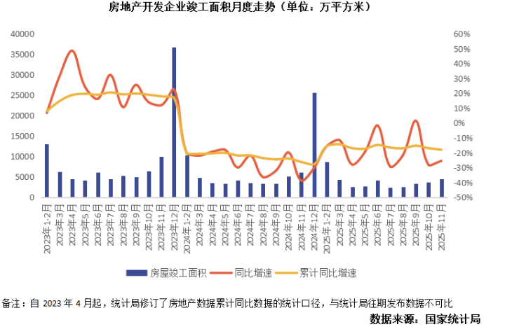 2025年前11月,全国房屋竣工面积达3.9亿平方米,同比下降18%,降幅较前10月扩大1.1个百分点;11月单月竣工面积4593万平方米,同比下降25.5%。从单月走势来看,尽管11月竣工面积同比仍处下降区间,但行业竣工量已呈现周期性回升态势,反映出各地正持续发力推进保交房工作。尽管竣工面积与新开工数据因统计口径不同不具备直接可比性,但从同比增速变化可清晰看出积极信号:年内竣工面积累计同比降幅控制在20%以内,显著小于三年前新开工面积超30%的同比降幅,这充分说明当前项目化险、保交房工作正取得实效。这一进展也得到政策层面印证——12月召开的中国经济年会上,中央财办副主任明确表示,今年以来重点领域风险化解成效显著,地方政府隐性债务置换有序推进,保交房任务已全面完成。