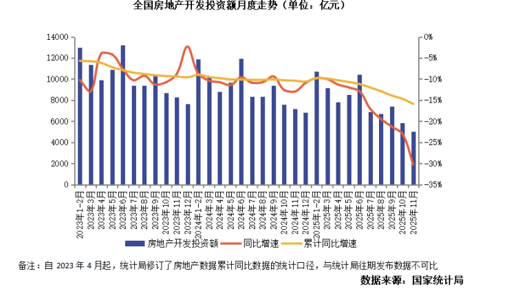 1—11月份,全国房地产开发投资78591亿元,同比下降15.9%,降幅高于同期新房销售额4.8个百分点。单看11月,开发投资额为5028亿元,同比下降30%,降幅较10月扩大7.3个百分点。