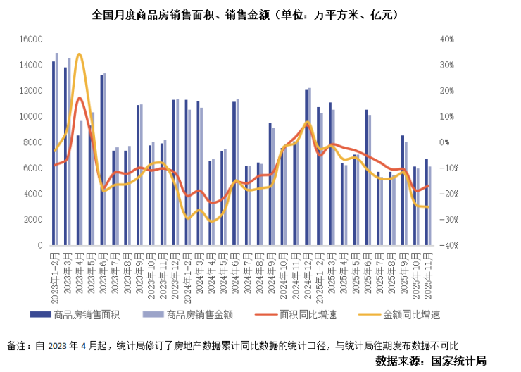 近日,国家统计局发布2025年11月宏观经济和房地产数据。国民经济稳步增长,社零同比增速出现回落。地产行业方面,因行业正处于转型发展的关键时期,再加之上年基数上升的影响,销售规模、房价、投资、国房景气指数均延续调整。不过从具体城市和项目的角度来看,新房价格、项目去化率等方面仍存有结构性亮点,行业供求压力也在持续好转。