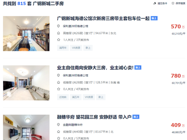 中海花湾壹号、保利曼城、珠江金茂湾、华发中央公园、金融城融穗华府、振业天颂、保利葛洲坝海德公馆等均有房源在挂牌出售。