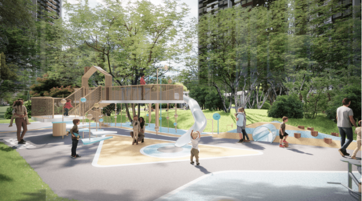 于是,整个项目的交互空间面积超过9万方,由一体化中央园林、滨河水岸公园构成。