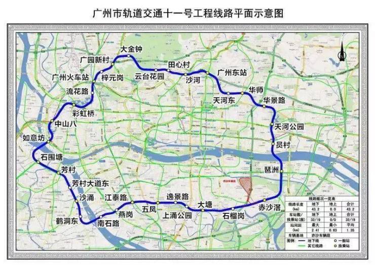 十一号线是一条环形线路,全长44.2公里,穿越天河、越秀、白云、荔湾和海珠五个老城区,地质条件和周边环境复杂,是广州地铁建设难度较大的一条线。