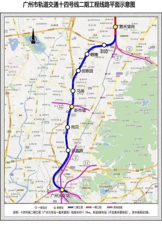 十四号线二期呈南北走向,线路主要穿越嘉禾望岗片区、白云新城片区、新市商业片区等产业成熟区和客流聚集区,主要解决白云沿线居民和通勤客流出行。