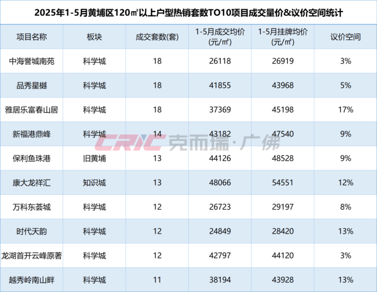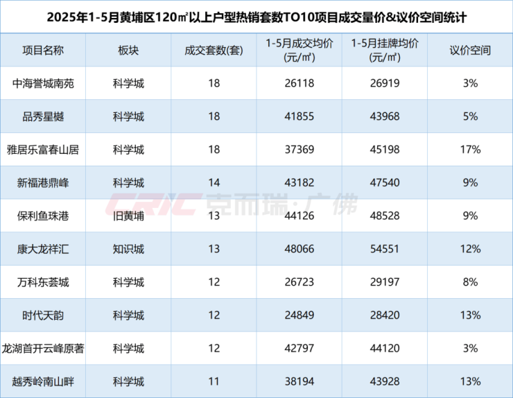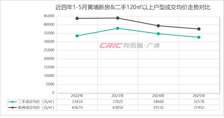 在价格上,克而瑞数据监测显示,今年1-5月黄埔区120㎡以上二手房成交均价32578元/㎡,较去年同时期下跌6%。