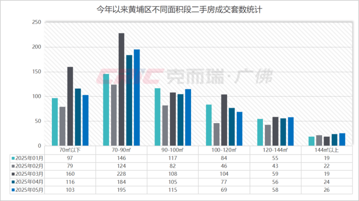 在物业类型上,克而瑞监测到,今年1-5月黄埔区120㎡以上二手房成交的物业类型中,别墅成交31套,同样呈现逐月走高的特征。