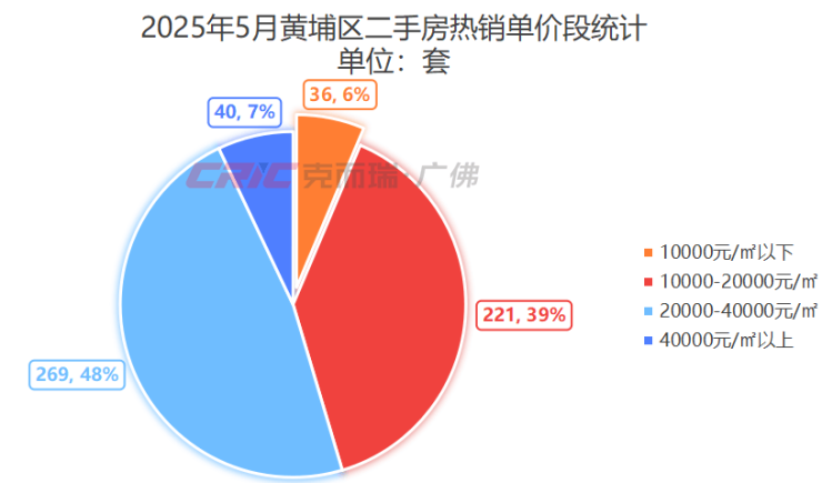 在成交结构上,克而瑞数据监测显示,5月黄埔二手房成交主力单价段为2-4万元/㎡,成交269套,占比达到48%,环比上月增长4%。