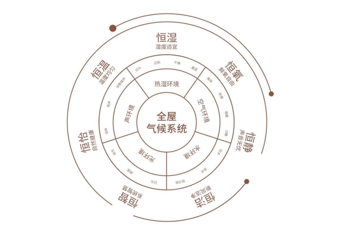 七恒健康系统包括了恒温、恒湿、恒氧、恒静、恒洁、恒智、恒怡七大功能,涵盖了热湿、空气、水、光、声等环境因素。