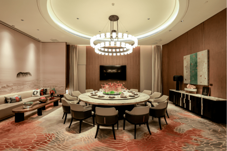 如果说上面谈及的三大功能侧重公用性,那么私宴会客厅则更注重“私人化”、“定制化”,营造私享的乐趣和优雅的氛围,为业主提供高品质的私享圈层社交。