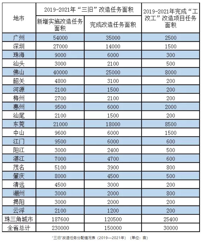 其中,《意见》主要聚焦当前各地反映的“三旧”改造入库门槛高、规划调整难、税费负担重、土地征拆难规划调整难、审批门槛高、税费负担重、土地征拆难等重点难点堵点问题,坚持问题导向和系统思维,提出19条针对性的改革措施。《三年行动方案》提出,提出至2021年,全省新增实施“三旧”改造面积23万亩以上,完成改造面积15万亩以上,投入改造资金5000亿元以上(社会投资约占85%,市县级财政投入约占15%)。