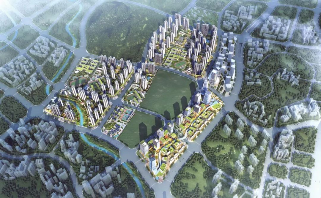 汤村旧村改造项目建新范围86.58公顷,总建筑面积269.15万平方米。项目总体布局为“双轴三心多片区”,依托九龙大道与创新大道,利用轨道站点的辐射作用,构建“双轴引领、东西串联、多片聚合”的整体空间格局。