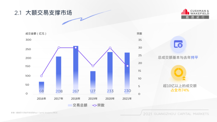 2021年,广州全年成交金额录得230亿,基本与去年持平,共录得18宗交易。与同样在大湾区里的深圳相反,广州总价超10亿的交易占全年的74%。随着中国经济的持续复苏,全球融资环境逐渐宽松,外资在本地市场表现积极,相比去年以本地买家为主,今年外资占比高达70%,占比大幅提升。
