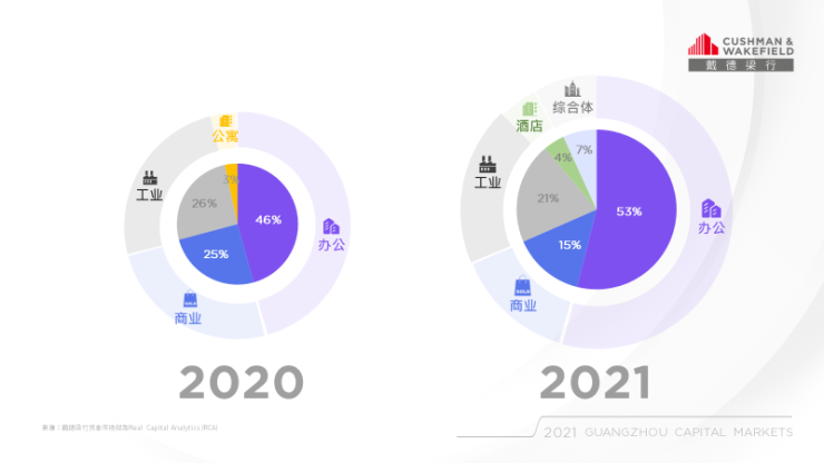 在物业类型中,写字楼投资仍然是投资者最为关注的投资类型,近年随着线上活动的增加,数据中心、物流园的需求大幅增加,工业连续第二年超过商业,成为第二大投资类型。