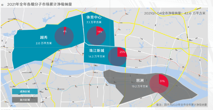 琶洲作为新兴区域,全年吸纳量录得19.2万平方米。片区土地出让基本完成,除互联网、科技企业之外,实业类企业总部也占据一席之地,片区产业结构持续丰富。对此,戴德梁行广州公司写字楼部主管及董事梁杰表示,琶洲目前已进入快速发展期,产业氛围已初步形成,已逐步成为广州科技类企业租赁的优选。预计未来随着多个总部的竣工入驻,产业虹吸效应将进一步提升。