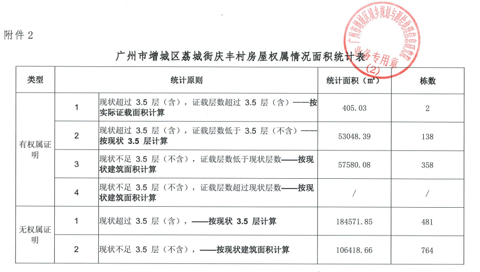 庆丰村房屋权属情况面积统计表另外,庆丰村旧改范围内有2颗细叶榕古树;2处公建配套及市政设施,分别是时代幼儿园和六一幼儿园;3处历史建筑线索、2处历史文物。