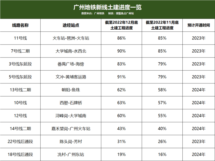 5号线东延段(文冲-黄埔客运港)、10号线(西塱-石牌桥)、7号线二期(大学城南-水西北)等线路分别以12%、6%、5%的月进度位居前列。