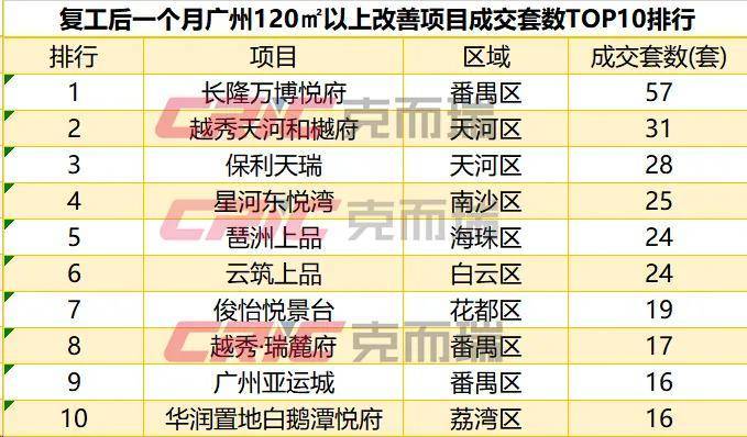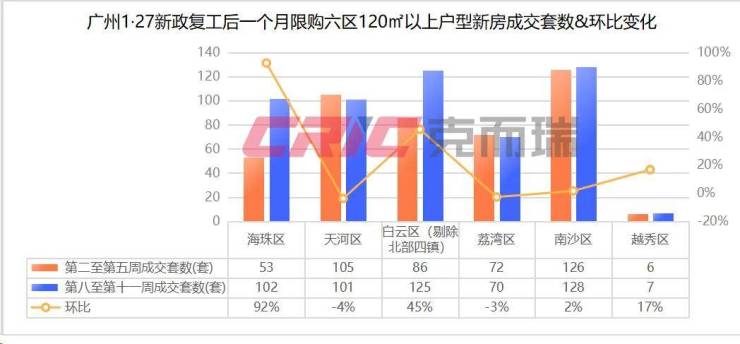 而新政最直接受益的天河,海珠,越秀,荔湾,南沙、以及白云(北部四镇除外)限购六区中,数据显示,复工后一个月限购六区120㎡以上户型新房成交533套,环比新政前一个月增加19%。