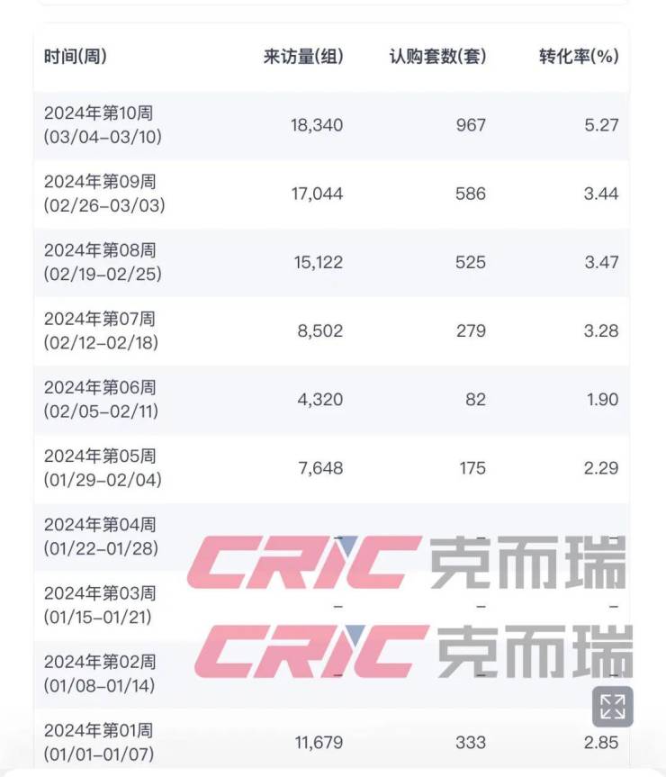 要注意,尽管从网签的数据的情况来看新政对楼市的前后提升效果并不明显,但从克而瑞对全市268个在售项目的实时来访认购监测显示,复工后三周全市来访认购量节节走高,尤其是第十周全市来访18340组,认购967套,为近两个月来的高位。