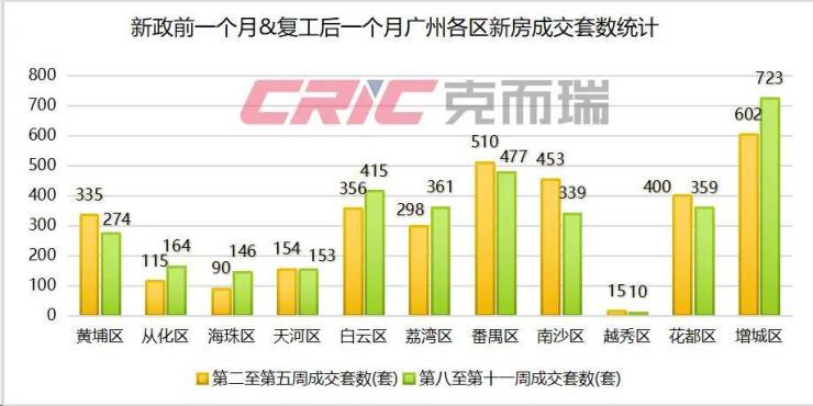 克而瑞数据监测显示,以春节假期周(第六、第七周)为临界值(因春节期间购房人少,剔除春节假期影响)新政前一个月(第二至第五周,下同)广州成交3328套商品住宅,复工后一个月(第八周至第十一周,下同)成交3421套。