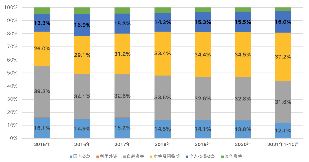 从国家统计局公布的数据来看,前10月,房地产开发企业到位资金16.7万亿元,同比增长8.8%。其中,国内贷款同比下降10%至2万亿,占比跌至12.1%;自筹资金同比增长5.1%至5.3万亿,占比跌至31.6%。此外,定金及预售款同比增长21%至6.2万亿,个人按揭贷款2.7万亿,同比增长9.7%,占比分别提升至37.2%和16%。