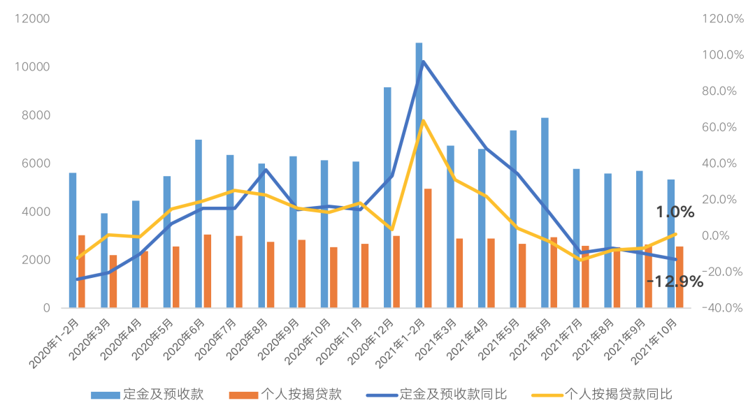 2021年下半年以来,全国房地产市场持续降温,企业销售回款同样陷入增长困境,房企资金周转压力不断加剧。2021年10月,定金及预收款新增5351亿元,同比下降12.9%,个人按揭贷款新增2554亿元,同比增长1%,相较于上半年两位数以上的高增长态势可谓一落千丈。