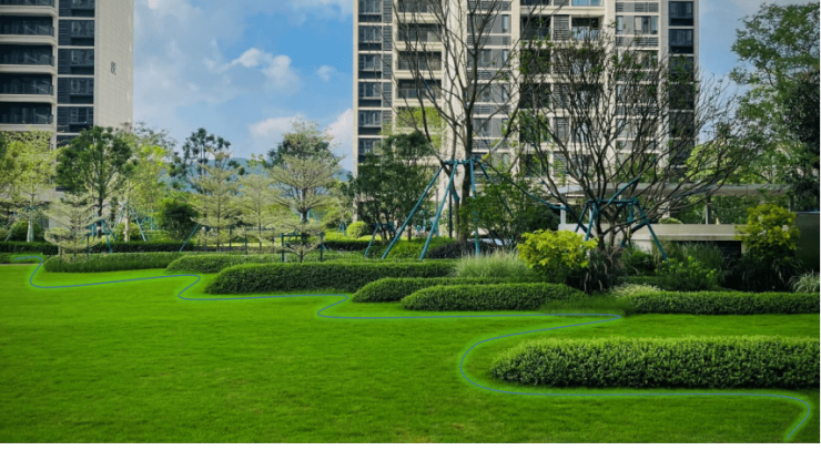 在龙湖独创的“碧泊珑翠”种植手法之上,整片草坪以“坪”为“泊”,以“垄”为“丘”,用蜿蜒曲折的溪流涌入湖泊的意象,表达场地空间的动态,令眼前无尽的苍翠与连绵远山呼应。
