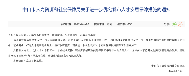 4月28日,中山市人社局发布通知,大专无社保可买一套房。值得一提的是,这是继佛山后,大湾区放松限购的第二城。