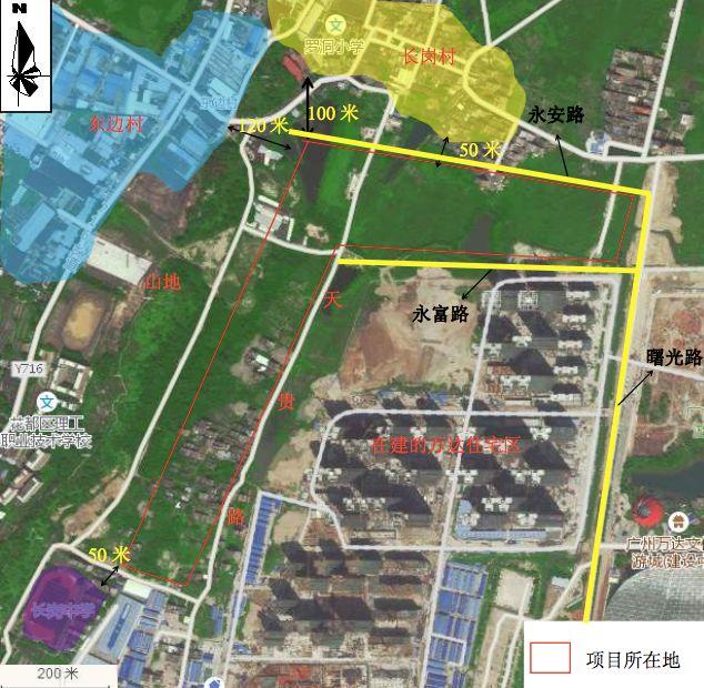 该项目选址在花都区花城街长岗村内,位于规划道路天贵路旁,东侧为规划道路曙光路和万达文化旅游城,东南侧为万达住宅区。