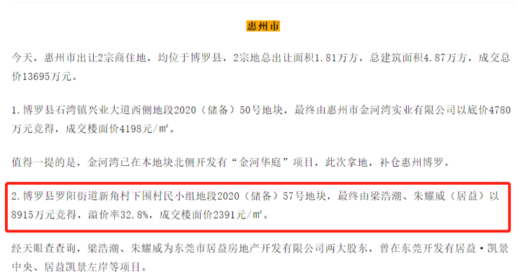 梁浩潮、朱耀威惠州拿地报道