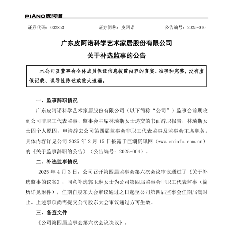 2025年4月3日,公司召开第四届监事会第六次会议,审议通过了《关于补选监事的议案》,同意补选郭玉琳女士为第四届监事会非职工代表监事。郭玉琳女士1990年7月出生,本科学历,2020年3月加入皮阿诺家居,现任公司财务管理中心工程应收主管。其任期将自股东大会审议通过之日起至第四届监事会届满时止。