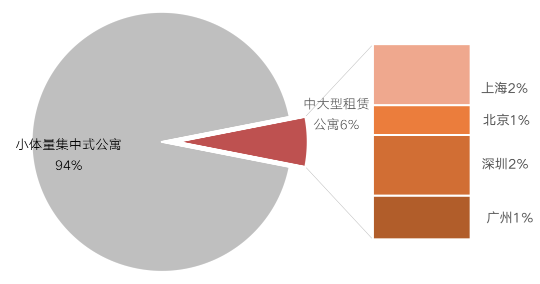 从目前来看,截至2021年4月,我国上海、北京、深圳、广州四大一线城市的集中式长租公寓中,项目体量超500间的中、大型租赁公寓项目仅占6%,其中,上海、深圳项目最多。
