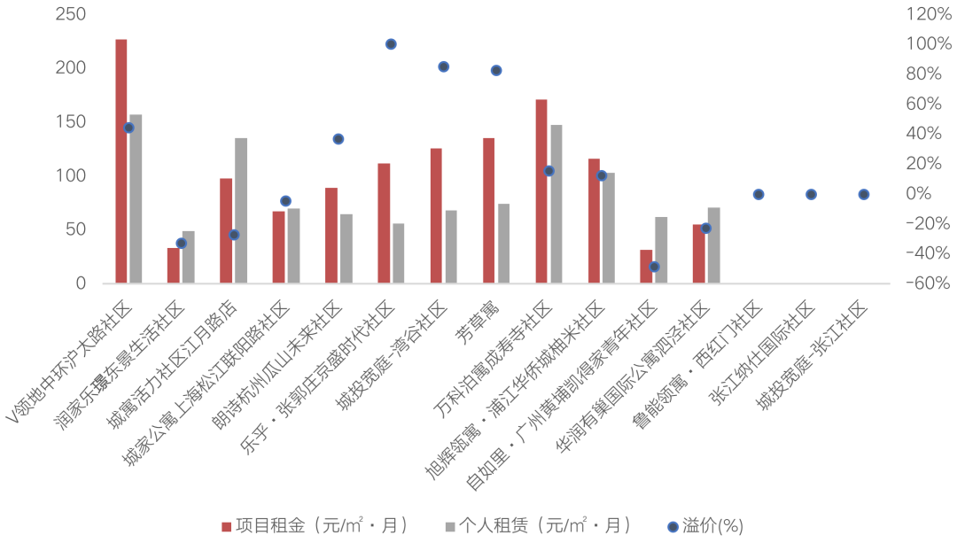 从目前已开业的项目租金价格与周边个人租赁价格进行比较分析发现,各个项目的溢价情况存在较大差异,部分项目存在明显价格优势,如润家乐璟东景生活社区、自如里·广州黄埔凯得家青年社区、乐乎·张郭庄京盛时代社区和城投宽庭-湾谷社区,这四个项目的出租率皆保持在95%的水平以上。由此可见,部分“大型租赁社区”颇受市场欢迎。