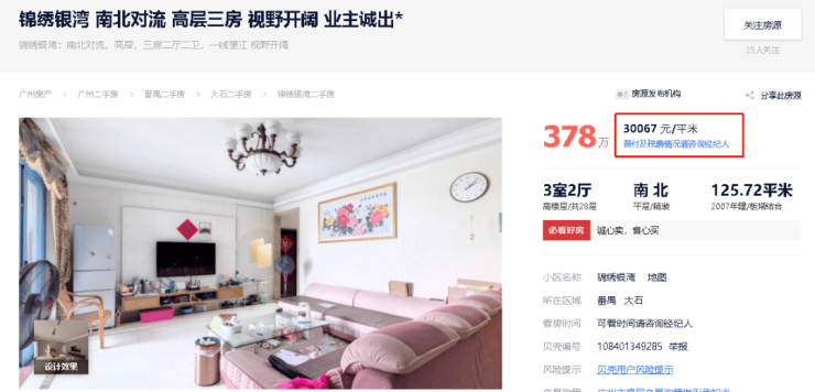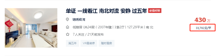 以二手交投相对火热的锦绣银湾为例,目前小区双证房挂牌价基本只挂到3万出头,而单证房的单价基本去到3.3万/㎡以上,甚至3.5万/㎡、3.7万/㎡都有。