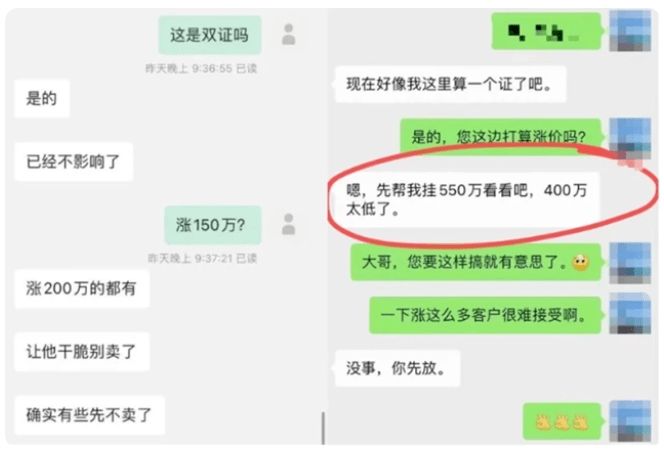 比如,小编最近在网上看到一张流传的微信截图,东莞某双证房业主得知即将可以合证后,连夜将房源报价从400万,提到了550万......