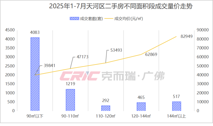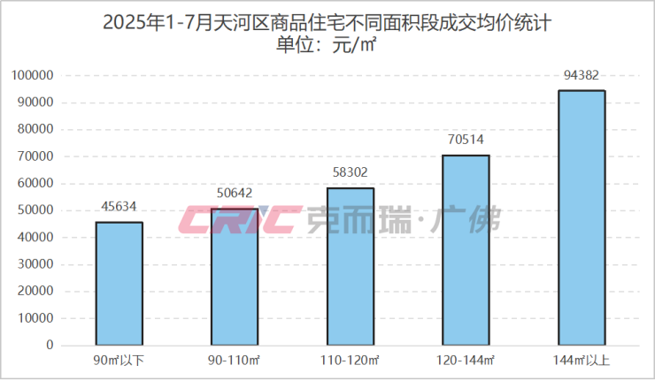 价格方面,克而瑞数据监测显示,今年1-7月,天河区新房不同户型均价呈现“越大越贵”的特征,其中凭借“核心地段改善物业相对稀缺”这一属性,144㎡户型成交均价94382元/㎡,较去年同时期上涨4%。