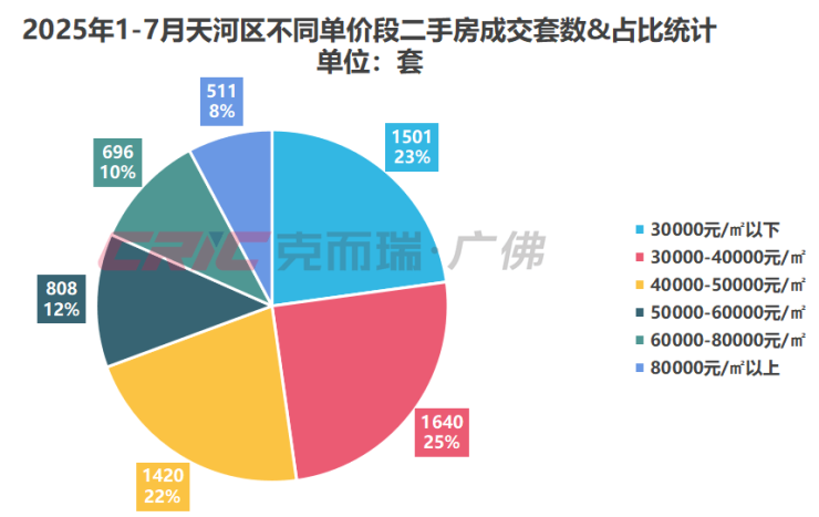 与新房一样,克而瑞数据监测显示,今年1-7月天河二手房热销单价段为3-4万元/㎡,共成交1640套,占比25%。