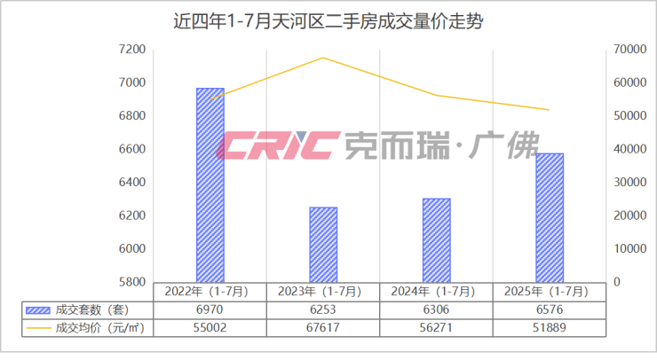 在二手房市场上,克而瑞数据监测显示,今年1-7月天河区二手房成交6576套,仅次于2022年同时期,成交均价51899元/㎡,较去年同时期下跌8%。