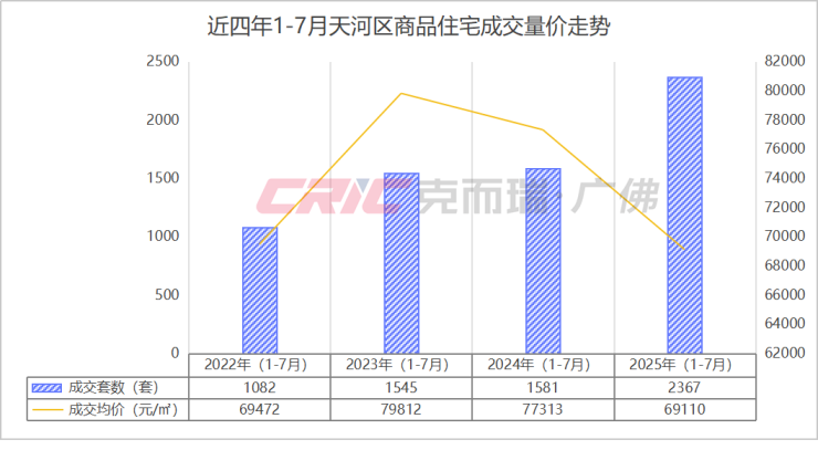 克而瑞数据监测显示,今年1-7月天河区商品住宅成交2367套,较去年同时期增长50%,还创下了近四年来同时期的最高记录,成交均价69110元/㎡,较去年同时期回落11%。
