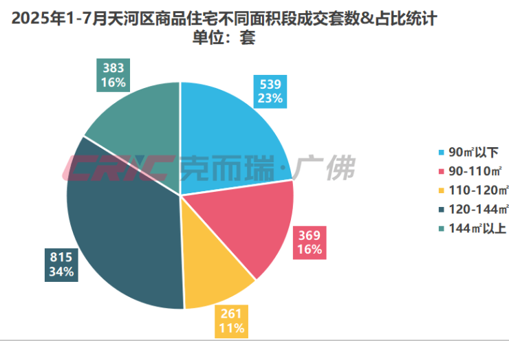 热销户型方面,克而瑞数据监测显示,今年1-7月天河商品住宅热户型为120-144㎡,共成交815套,占比34%,其次是90㎡以下户型,共成交539套,占比23%,达到了历年同时期最高。