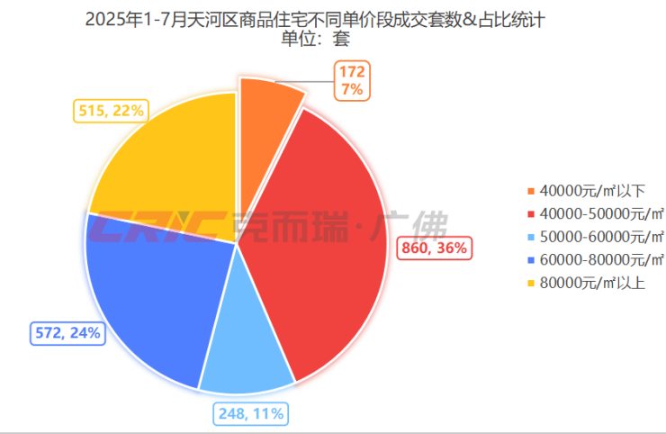 细看成交结构,克而瑞数据监测显示,今年1-7月天河商品住宅热销单价段为4-5万元/㎡,成交860套,占比36%。