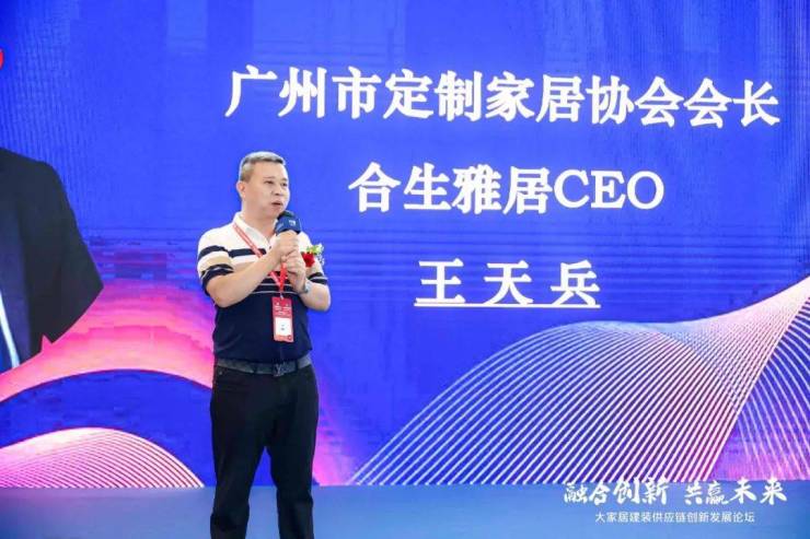 广州市定制家居协会会长、合生雅居CEO王天兵上台致辞,他认为整装的三个核心点是:第一是全案设计;第二供应链的整合;第三是最后“一公里”交付的完美体验决定未来。王天兵倡议与会企业家共同参加大家居建装,一起拥抱行业,积极推动行业发展。