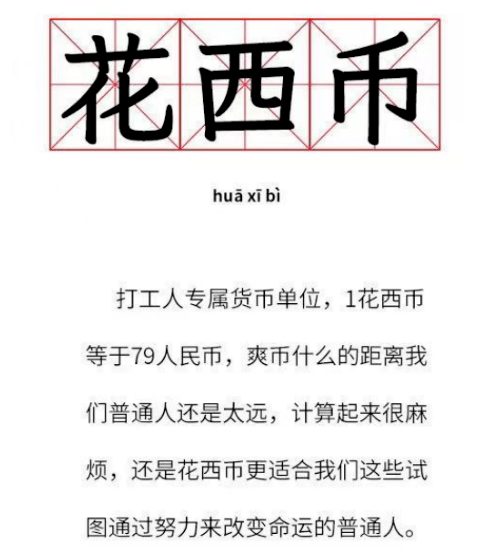在网友的调侃下,“花西币”横空出世,一花西币=79元人民币,成为更适合打工人的“专属货币单位”。