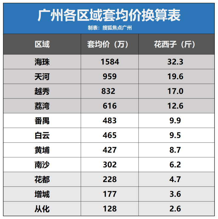 细分到具体区域,海珠套均价最贵,1584万元,需要32斤花西子;中心区其他三区越秀荔湾天河处于第一梯队,套均价需要12-20斤花西子;