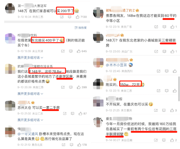 评论里各个IP的网友也分别道出了这个价格,在他们城市能买到多大面积的房子。