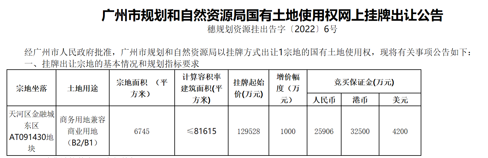 近日,广州市天河区金融城东区AT091430地块挂牌出让,地块占地6745㎡,计容建面81615㎡,起拍总价12.9528亿元。
