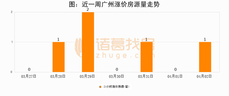 根据诸葛找房数据显示,广州24小时涨价房源量为1套,较04月01日增加1套,环比上涨0%。与此同时,涨价房源占比小幅扩大,业主信心有所提升。