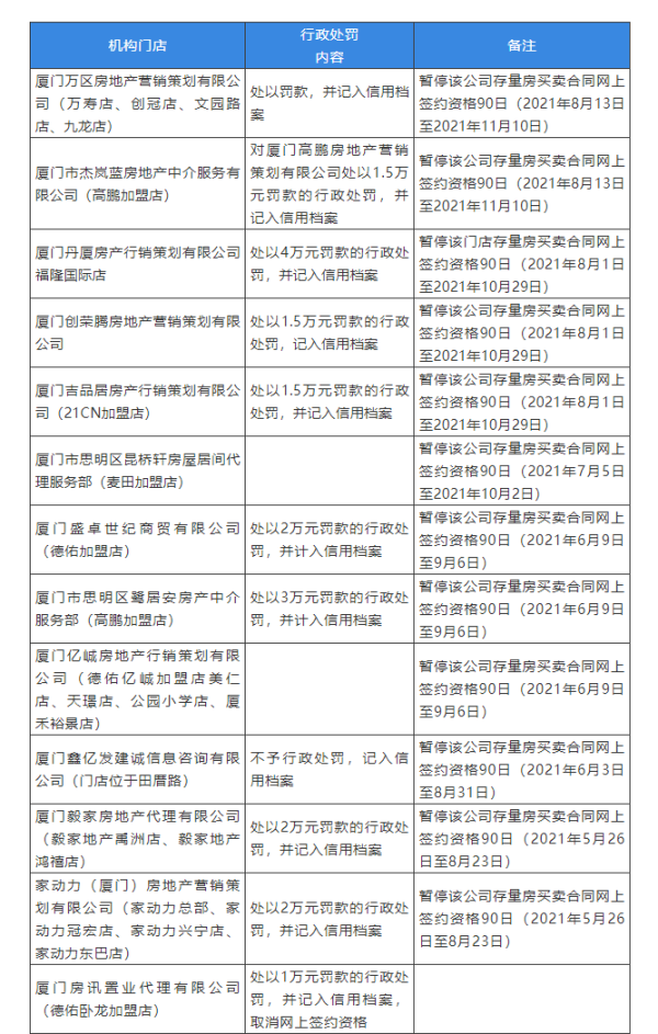 根据官方披露的信息,厦门市目前已累计暂停15家房地产经纪机构共31家门店的存量房买卖合同网上签约资格;取消1家房地产经纪机构的存量房买卖合同网上签约资格。此外,已协调解决房产交易纠纷40起,所涉房产交易价值约1.8亿元。