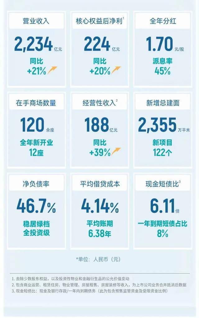 这在龙湖财报中得到了体现:2021年龙湖集团营业额同比增长21.0%至人民币2233.8亿,其中物业投资业务收入同比增长37.5%至104.1亿,合同销售额同比增长7.2%至2900.9亿。