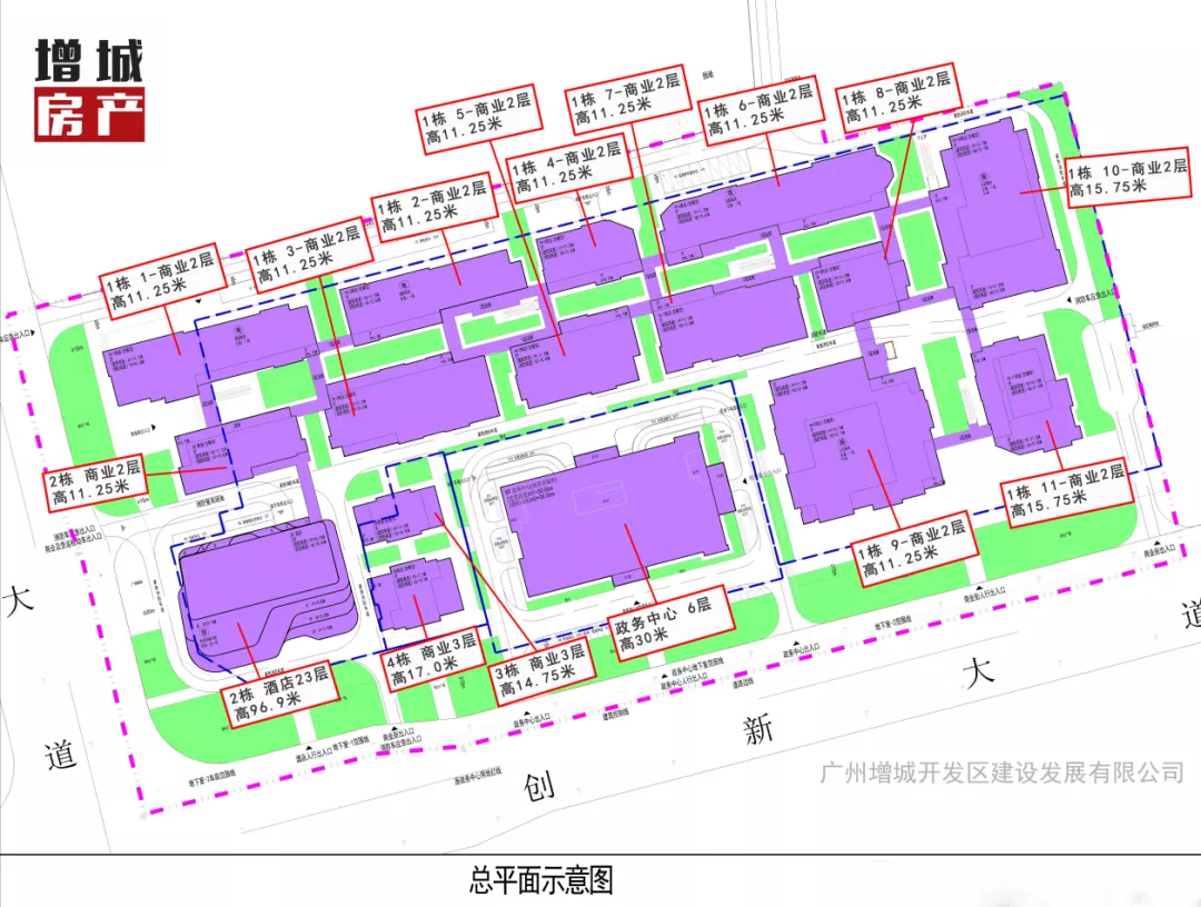 整个项目由3栋商业楼、1栋酒店和政务中心组成,较高96.9米,较低11.25米。其中,第1栋商业楼由11块构成,2块高度为15.75米,其余为11.25米,而第二栋和第三栋商业楼高度分别为14.75米和17米。