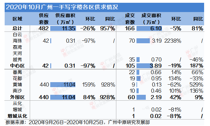 10月广州一手写字楼市场供应连续两个月突破10万方;本月入市482套11.35万㎡,仅次于上月的15.34万㎡,成为年内第二高位。本月广州写字楼市场收获大宗交易,整体成交高位企稳,为166套6.10万㎡,环比微跌5%,同比上涨81%。